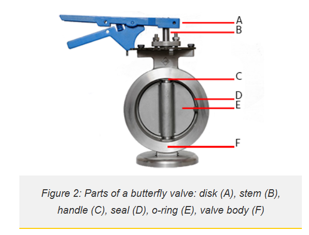 Prinsip injap OperasiButterfly mempunyai pembinaan yang agak mudah. Rajah 2 menunjukkan komponen utama injap rama -rama, yang merupakan badan, meterai, cakera, dan batang. Cakera (Rajah 2 berlabel E) injap rama -rama sejajar dengan pusat paip yang disambungkan dan batang (Rajah 2 berlabel B) menghubungkan ke penggerak atau pemegang di luar injap. Dalam kedudukan tertutup, cakera berserenjang dengan aliran, seperti yang ditunjukkan dalam Rajah 2, dan meterai terhadap kerusi injap (Rajah 2 berlabel d). O-ring (Rajah 2 berlabel C) dalam meterai pembungkusan batang terhadap kebocoran di sepanjang batang. Apabila penggerak atau pemegang berputar batang injap rama -rama 90 °, cakera juga berputar 90 ° menjadi selari dengan aliran. Putaran separa membolehkan alirannya dilancarkan atau berkadar.